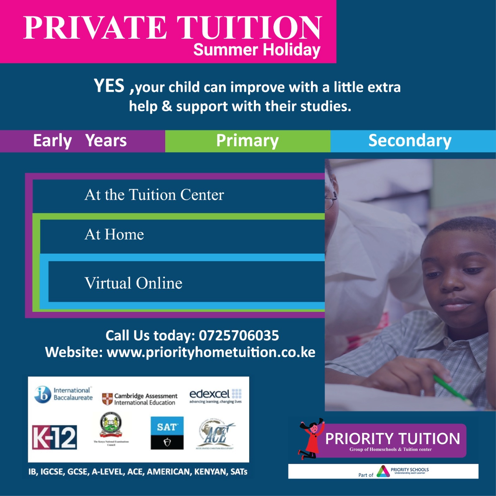 We offer all subjects cutting across IGCSE, IB, GCSE, A-LEVEL, ACE, AMERICAN , SATs , KENYAN(KCPE, KCSE)